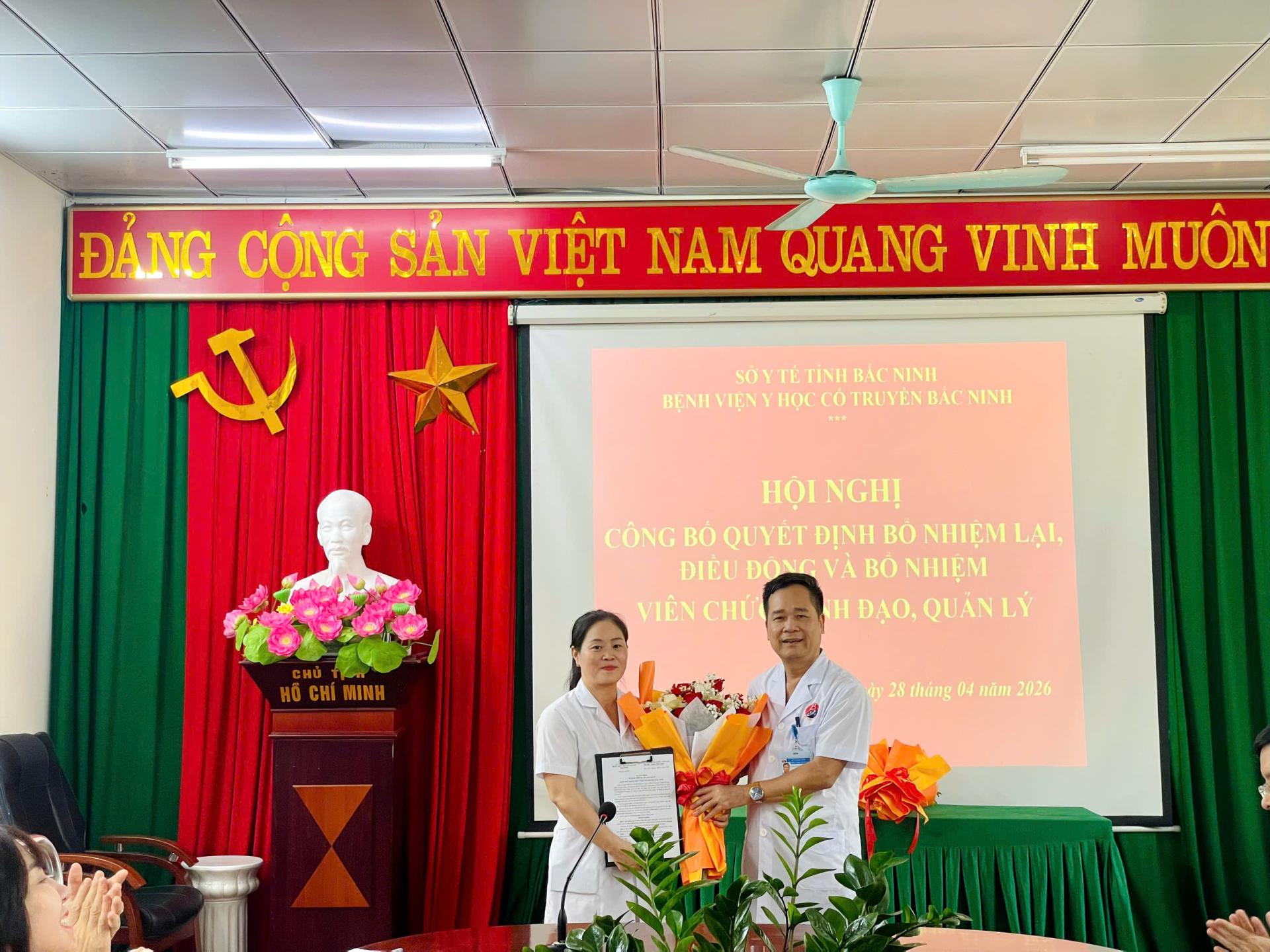 Chiều ngày 28/4/2026, vào lúc 16h00, Bệnh viện Y học cổ truyền Bắc Ninh tổ chức Hội nghị công bố các quyết định về công tác cán bộ, đặc biệt là đội ngũ quản lý điều dưỡng, với sự tham dự của Ban Giám đốc, lãnh đạo các khoa, phòng cùng đông đảo viên chức, người lao động trong đơn vị.