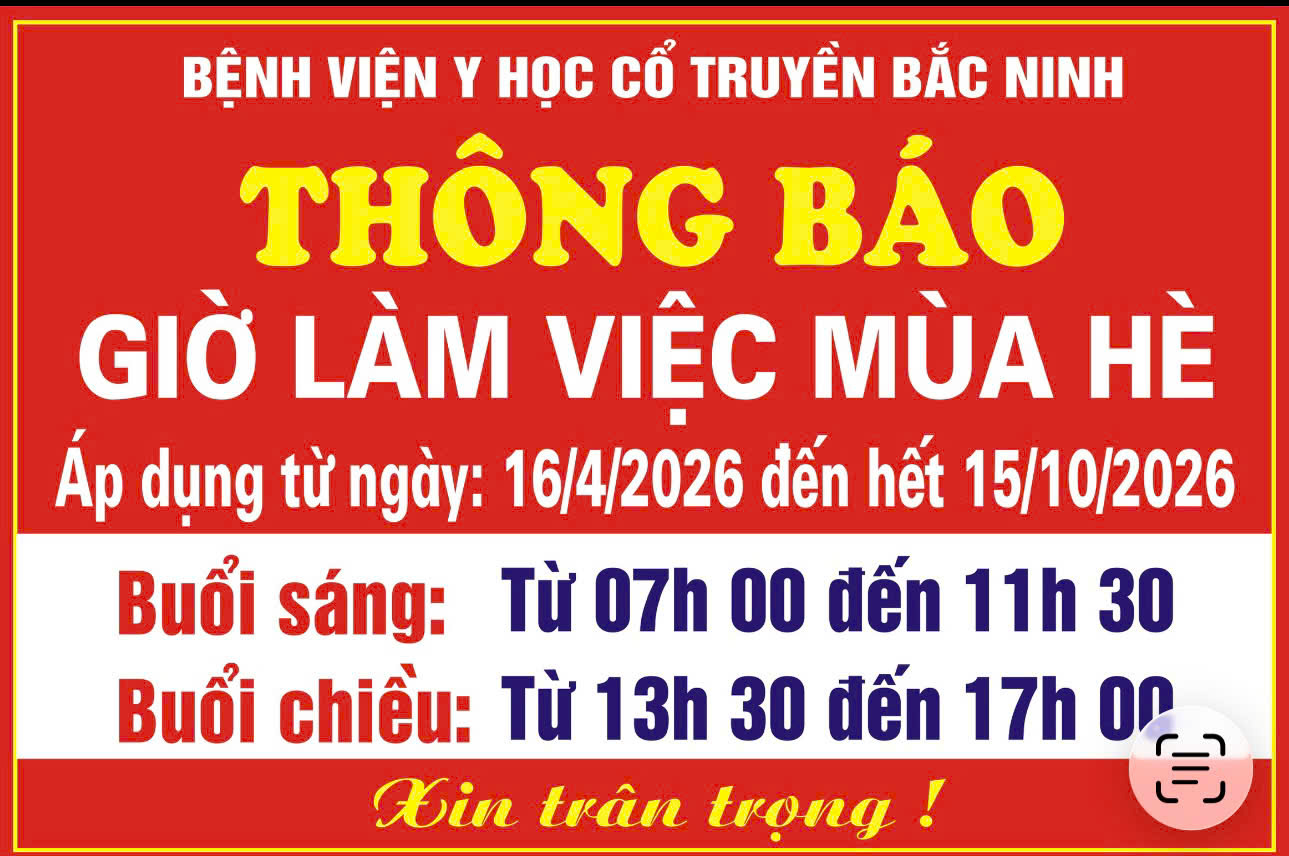 Bệnh viện Y học Cổ truyền Bắc Ninh xin thông báo giờ làm việc mùa hè bắt đầu từ ngày 16/04/2026.