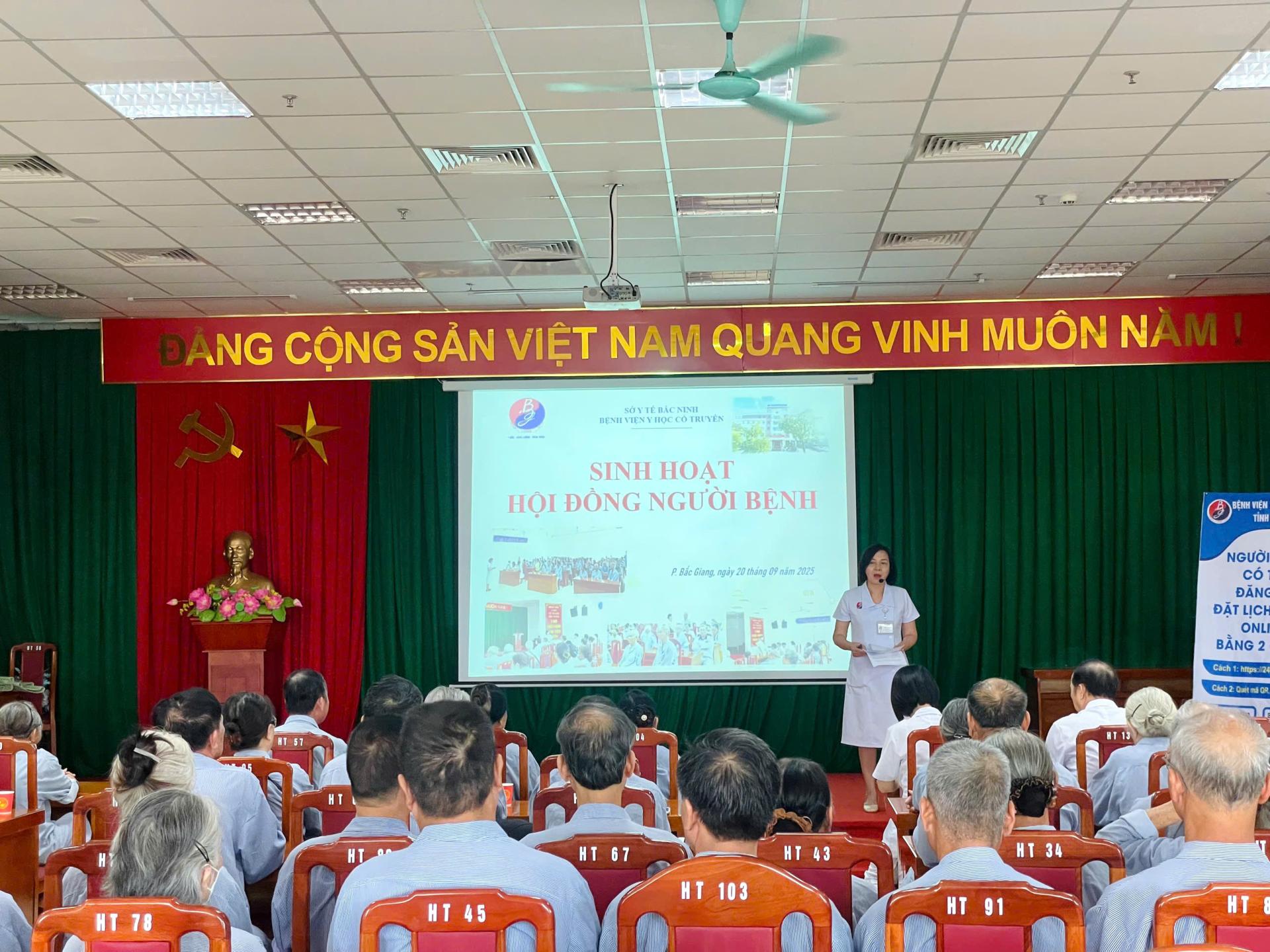 Chiều ngày 19/9/2025, Bệnh viện Y học cổ truyền Bắc Ninh đã tổ chức buổi sinh hoạt Hội đồng người bệnh thường kỳ với sự tham dự của đại diện Ban Giám đốc, lãnh đạo các khoa/phòng, điều dưỡng viên cùng đông đảo người bệnh và người nhà đang điều trị nội trú.