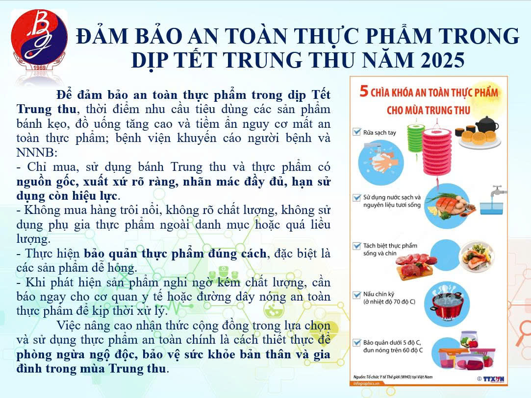 Song song với chủ đề tim mạch, bệnh viện cũng tuyên truyền tới người bệnh và người nhà về các biện pháp đảm bảo an toàn thực phẩm trong dịp Tết Trung thu, thời điểm nhu cầu tiêu dùng các sản phẩm bánh kẹo, đồ uống tăng cao và tiềm ẩn nguy cơ mất an toàn thực phẩm.
