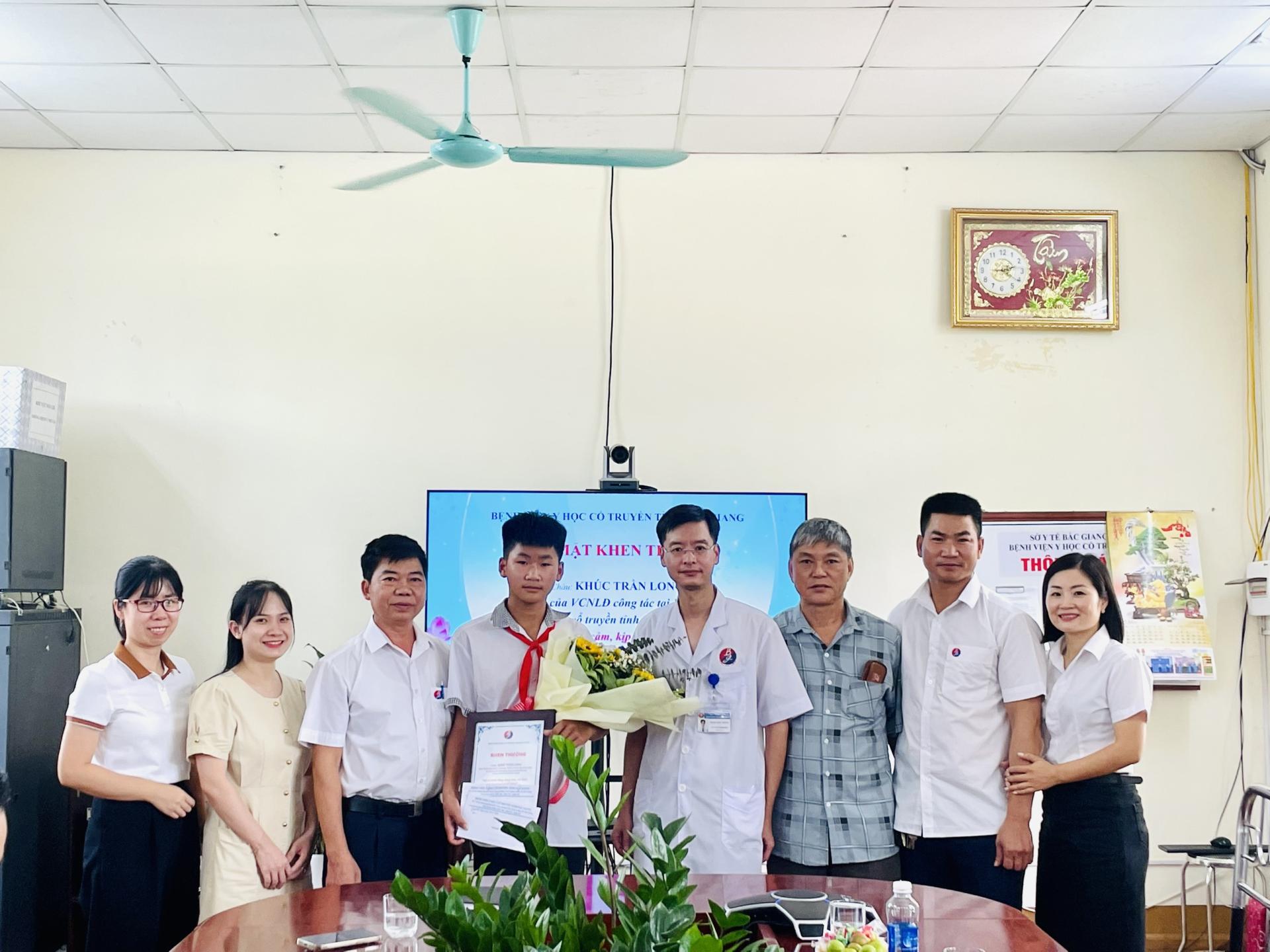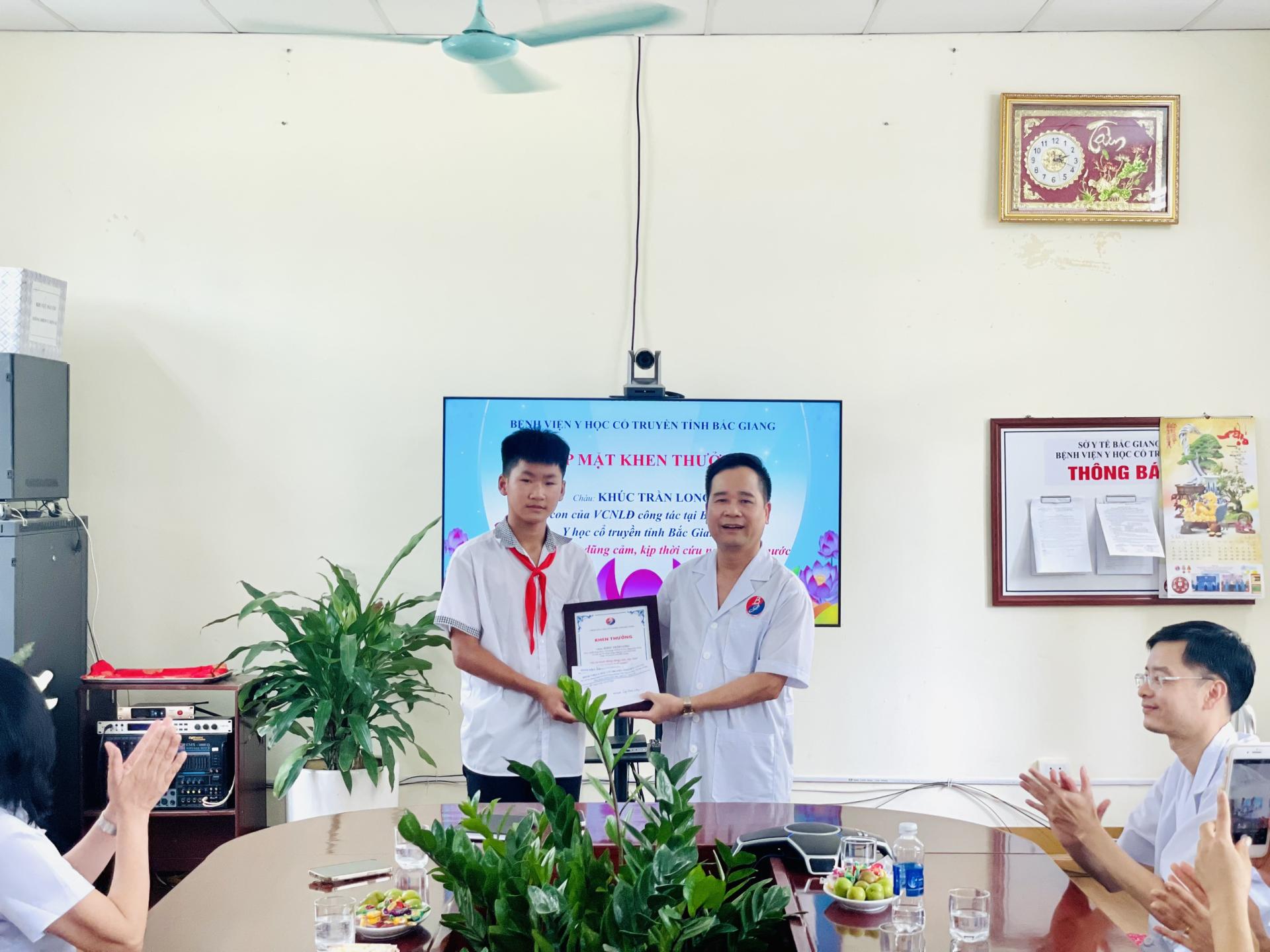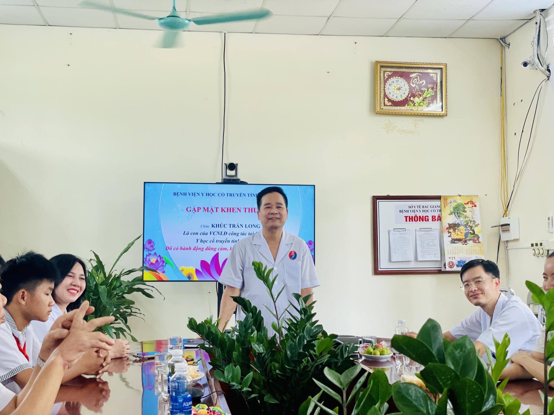 ThsBS Nguyễn Văn Toàn – Giám đốc Bệnh viện rất vui mừng, biểu dương hành động dũng cảm, rất đáng được tuyên dương, tự hào của cháu Long; sự có mặt kịp thời, không quản ngại khó khăn, nguy hiểm để cứu người đuối nước của cháu Long là tấm gương góp phần lan tỏa về những hành động đẹp, ý nghĩa trong cuộc sống. Đồng thời, Giám đốc bệnh viện trao tặng hoa và quà động viên khích lệ tinh thần dũng cảm của cháu Long – con của VC-NLĐ đang công tác tại Bệnh viện Y học cổ truyền tỉnh Bắc Giang.