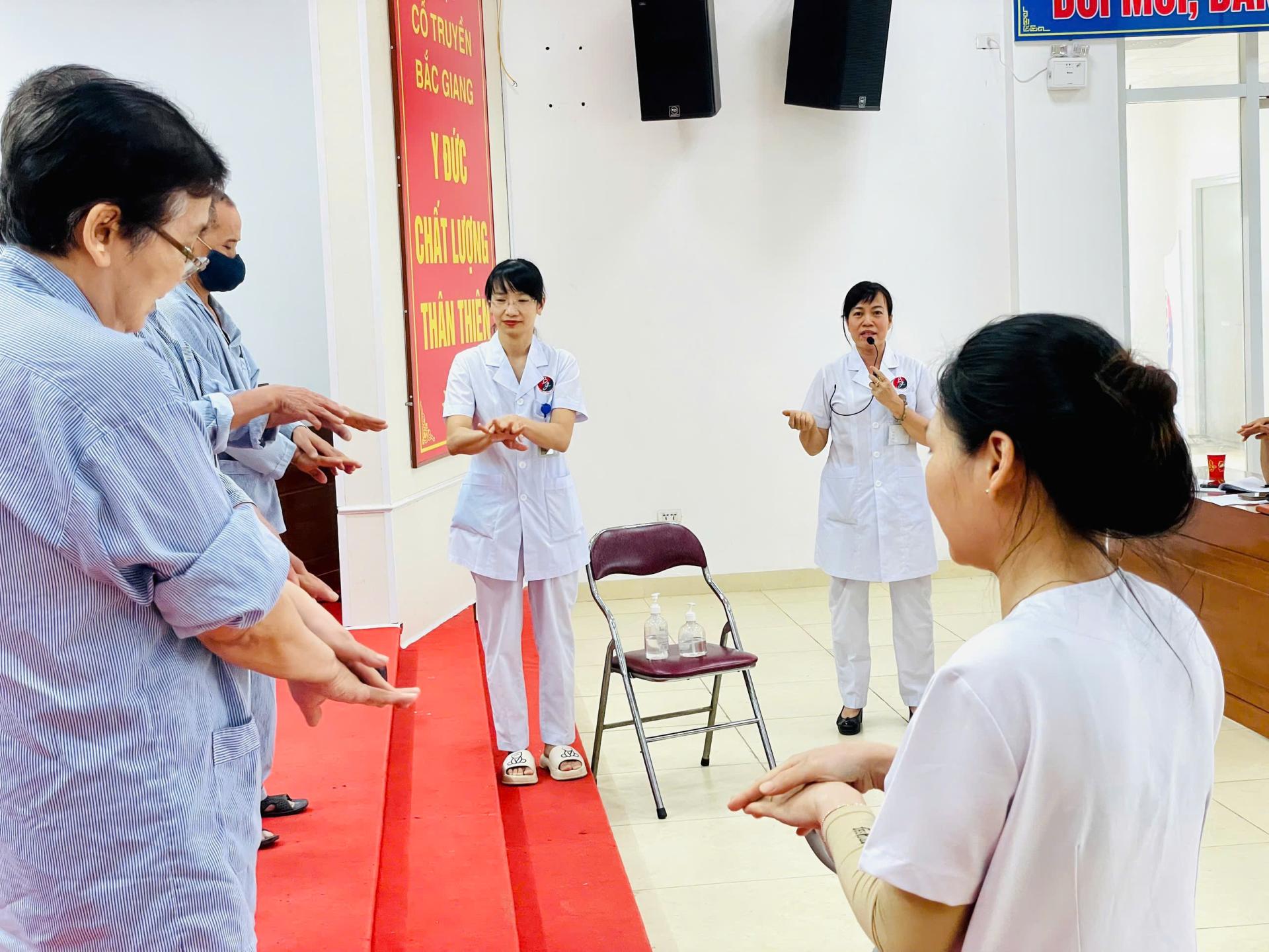 Sau phần sinh hoạt, khoa Kiểm soát nhiễm khuẩn lồng ghép tập huấn kỹ năng vệ sinh tay đúng cách theo quy trình chuẩn Bộ Y tế. Người bệnh và người nhà được hướng dẫn thực hành trực tiếp các bước vệ sinh tay với dung dịch sát khuẩn nhanh hiểu rõ tầm quan trọng của việc giữ gìn vệ sinh tay trong phòng ngừa lây nhiễm chéo tại bệnh viện; nâng cao ý thức cho người bệnh và người nhà trong việc bảo vệ sức khỏe cộng đồng trong môi trường bệnh viện.