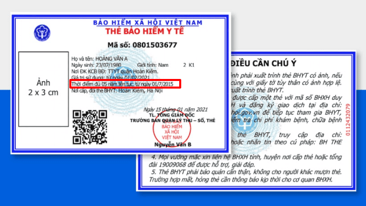 - Thời gian tham gia BHYT 5 năm liên tục là khi người tham gia BHYT có thời gian đóng 05 năm liên tiếp, trong đó được phép gián đoạn tối đa 03 tháng. Thời điểm tham gia BHYT đủ 5 năm liên tục sẽ được in trực tiếp lên thẻ BHYT.