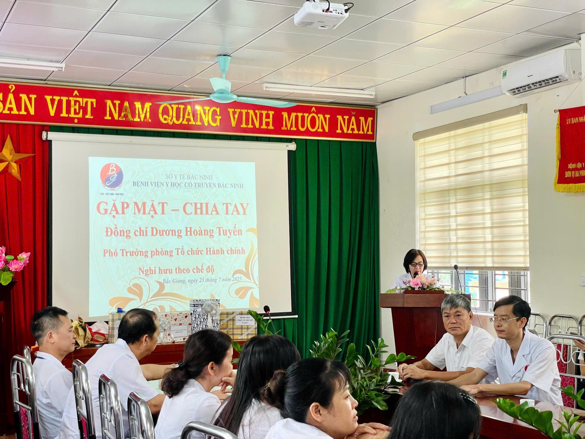Chiều ngày 23/7/2025, Bệnh viện Y học cổ truyền Bắc Ninh đã tổ chức buổi gặp mặt, chia tay đồng chí Dương Hoàng Tuyến – Phó Trưởng phòng Tổ chức – Hành chính, nhân dịp đồng chí nghỉ hưu theo chế độ.
