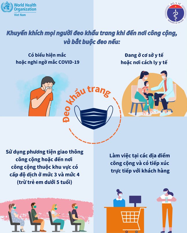 - Áp dụng với tất cả các đối tượng (trừ những người cách ly ở trong phòng đơn; người bị suy hô hấp, người bệnh đang phải thực hiện thủ thuật y tế theo chỉ định của bác sĩ, trẻ em dưới 5 tuổi).