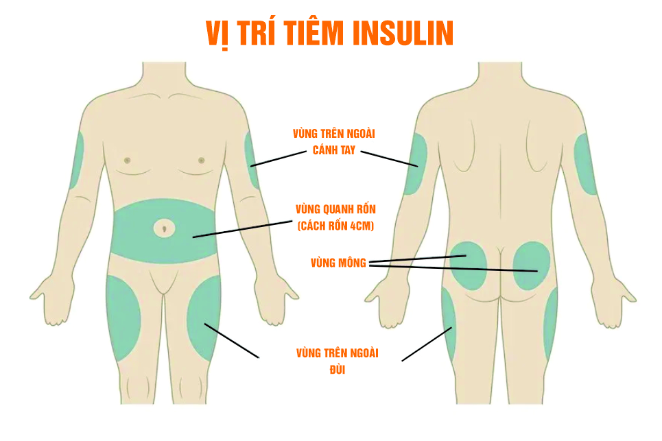 Đùi: Đây là vị trí hấp thu insulin chậm nhất nhưng lại thuận lợi cho người bệnh tự tiêm. Khi tiêm đùi, cần đâm kim vào phía trước của đùi, đoạn giữa đầu gối và háng, hơi lệch về phía ngoài chân