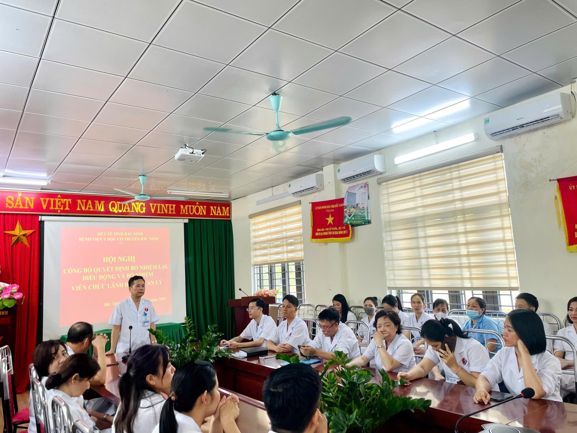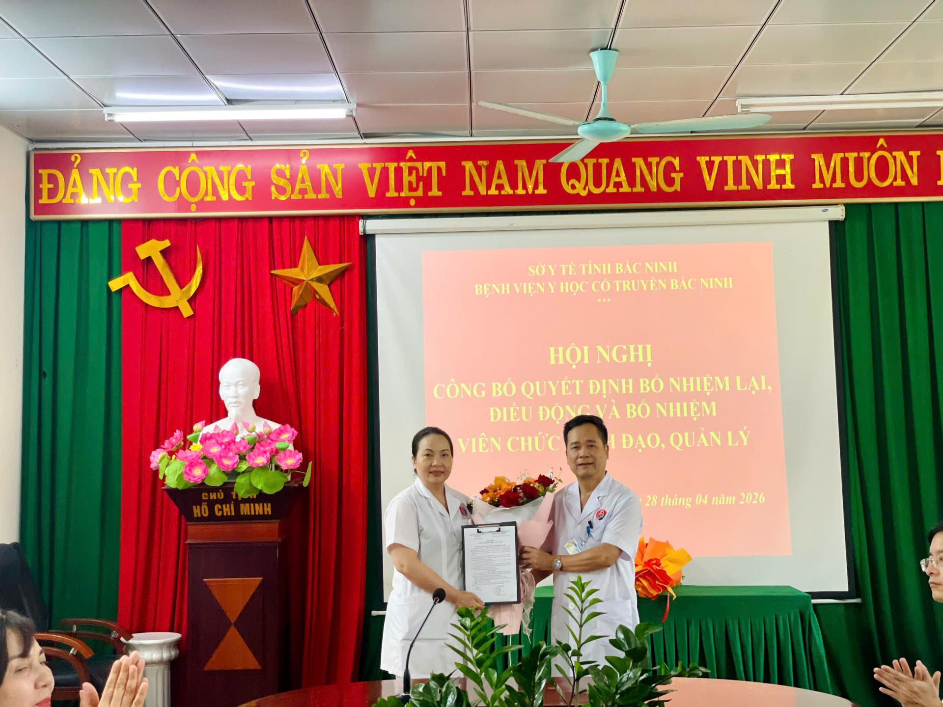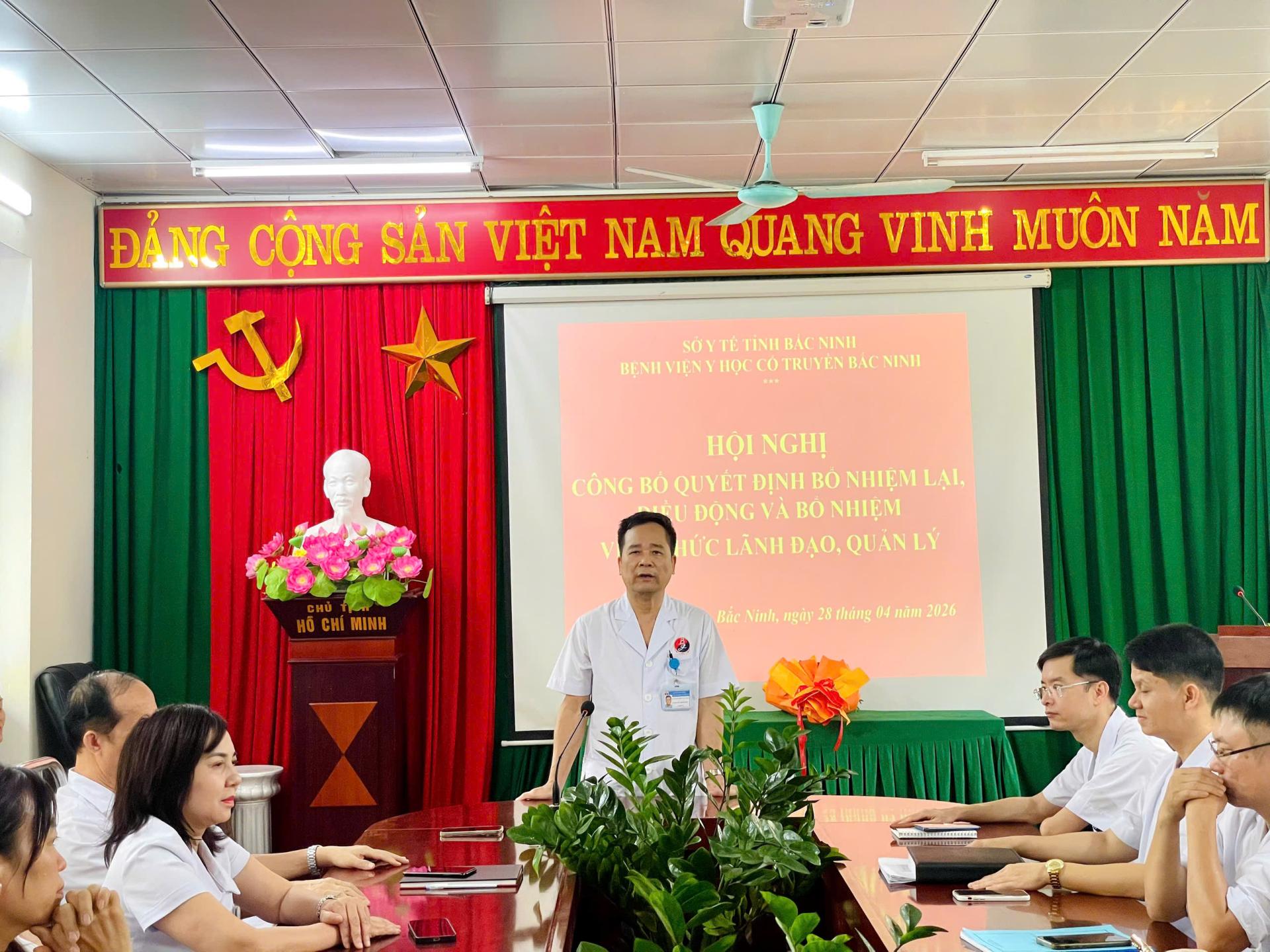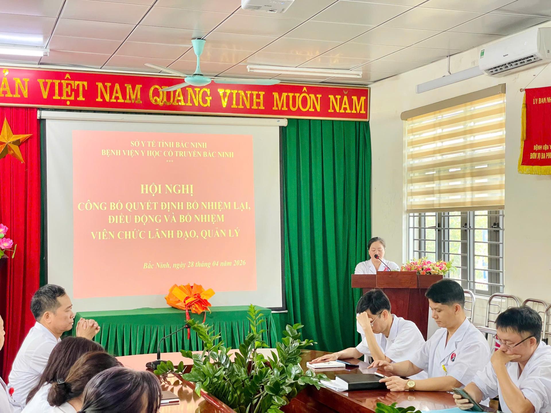 Chiều ngày 28/4/2026, vào lúc 16h00, Bệnh viện Y học cổ truyền Bắc Ninh tổ chức Hội nghị công bố các quyết định về công tác cán bộ, đặc biệt là đội ngũ quản lý điều dưỡng, với sự tham dự của Ban Giám đốc, lãnh đạo các khoa, phòng cùng đông đảo viên chức, người lao động trong đơn vị.