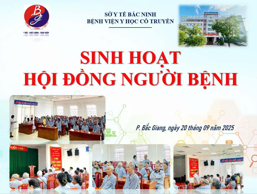 Chiều ngày 19/9/2025, Bệnh viện Y học cổ truyền Bắc Ninh đã tổ chức buổi sinh hoạt Hội đồng người bệnh thường kỳ với sự tham dự của đại diện Ban Giám đốc, lãnh đạo các khoa/phòng, điều dưỡng viên cùng đông đảo người bệnh và người nhà đang điều trị nội trú.