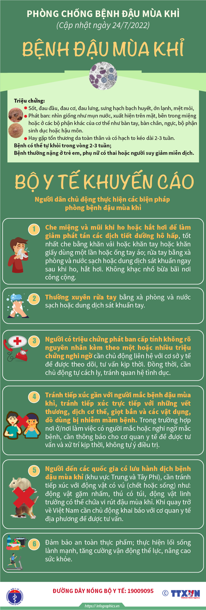 Để chủ động phòng chống dịch bệnh Đậu mùa khỉ ở nước ta, Bộ Y tế đã ban hành khuyến cáo người dân chủ động thực hiện các biện pháp phòng bệnh sau: