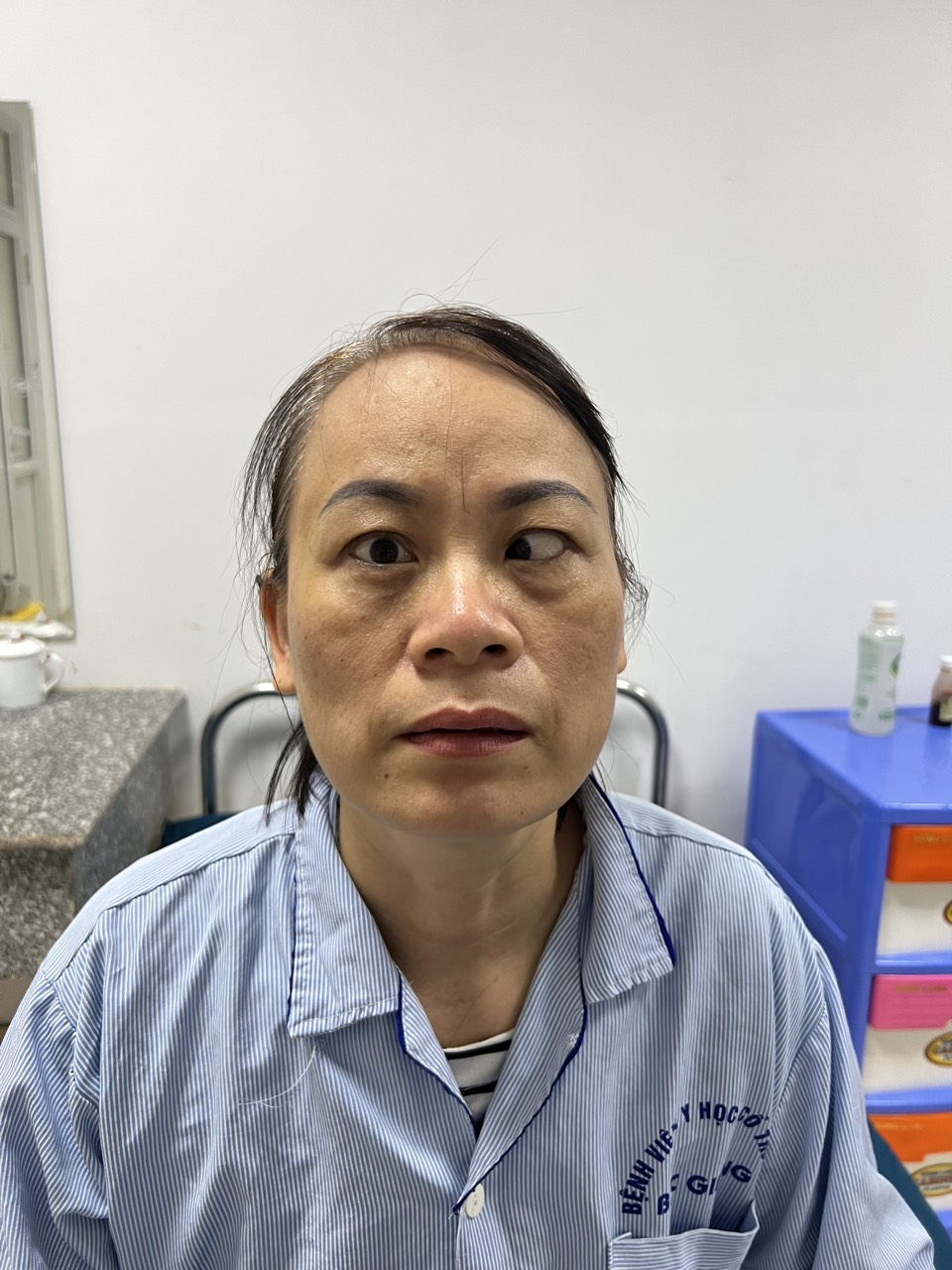 (Người bệnh bị liệt dây thần kinh số VI bên phải; hình ảnh người bệnh đang nhìn sang phải, mắt phải không đưa được ra ngoài)