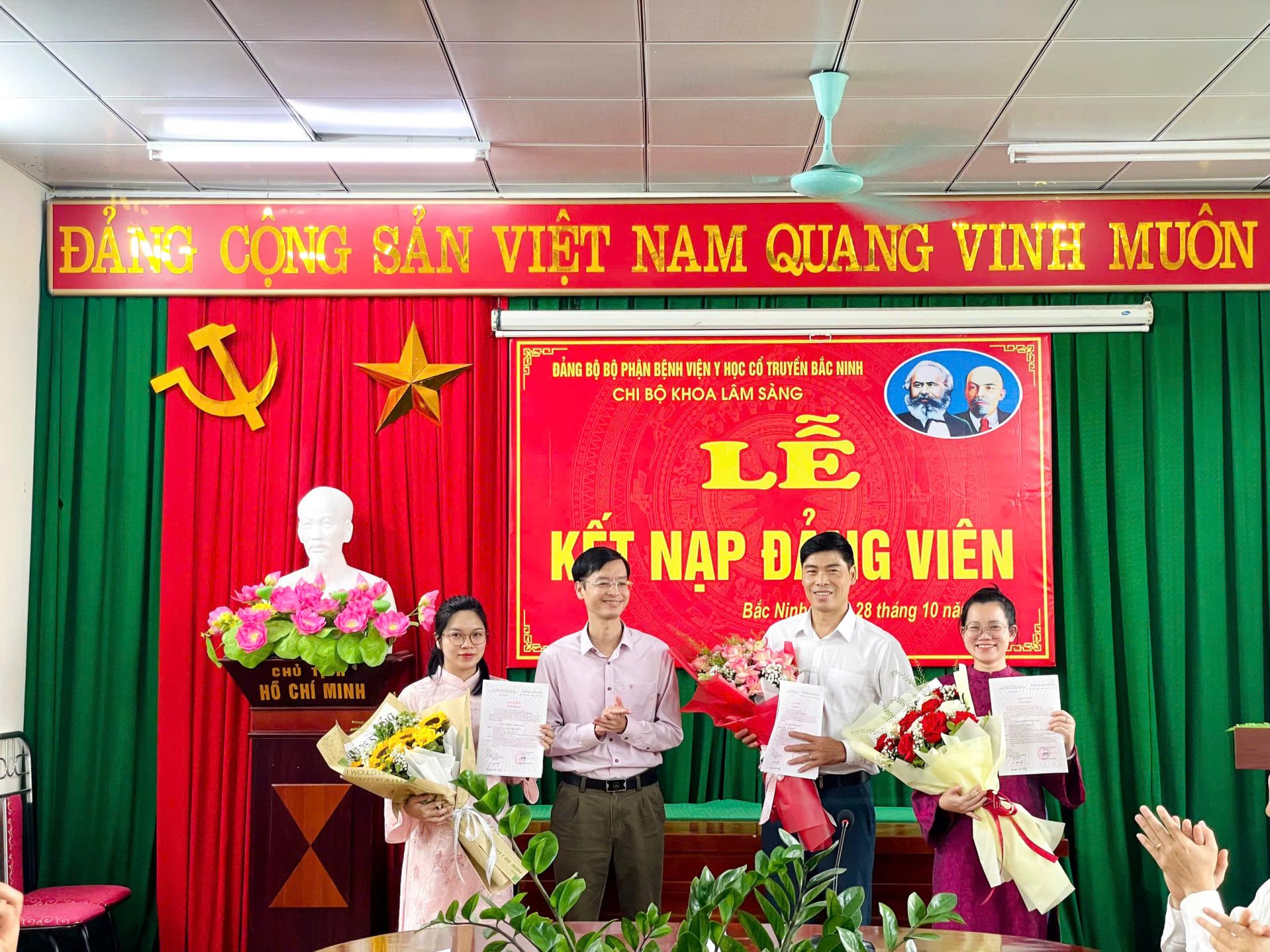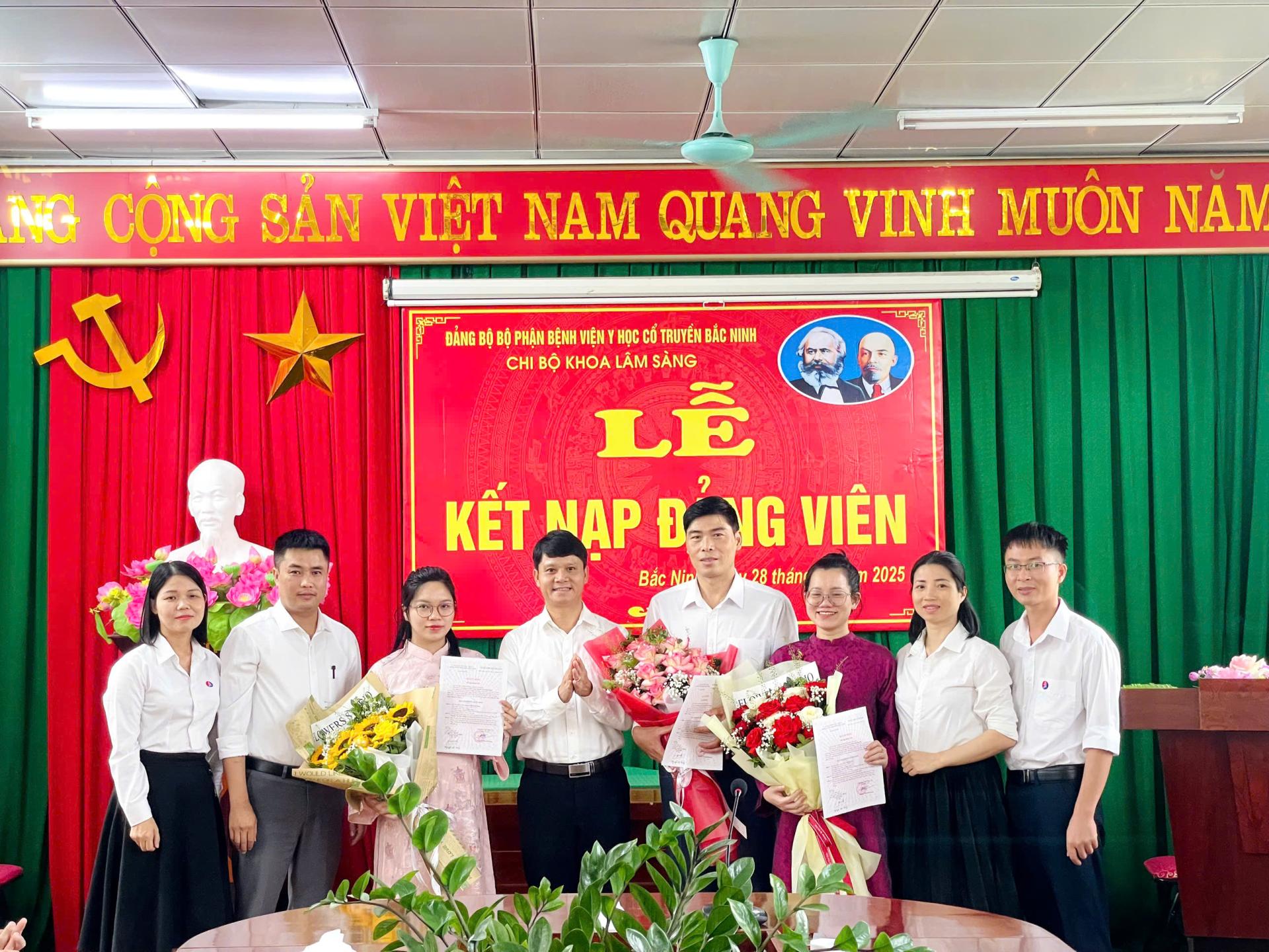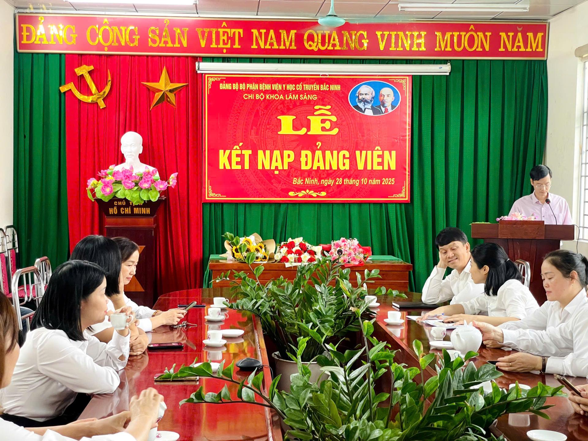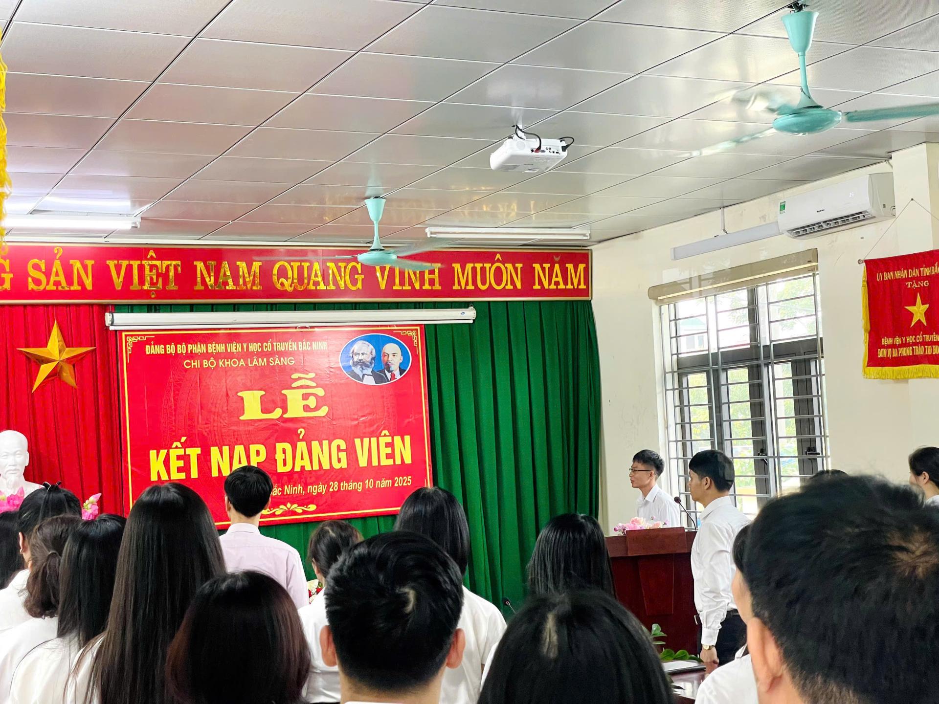 Chiều ngày 28/10/2025, Chi bộ Khoa Lâm sàng, Đảng bộ bộ phận Bệnh viện Y học cổ truyền Bắc Ninh đã long trọng tổ chức Lễ kết nạp Đảng viên cho ba quần chúng: Nguyễn Văn Định, Phan Thị Thu Hà và Nguyễn Thuỳ Dung.