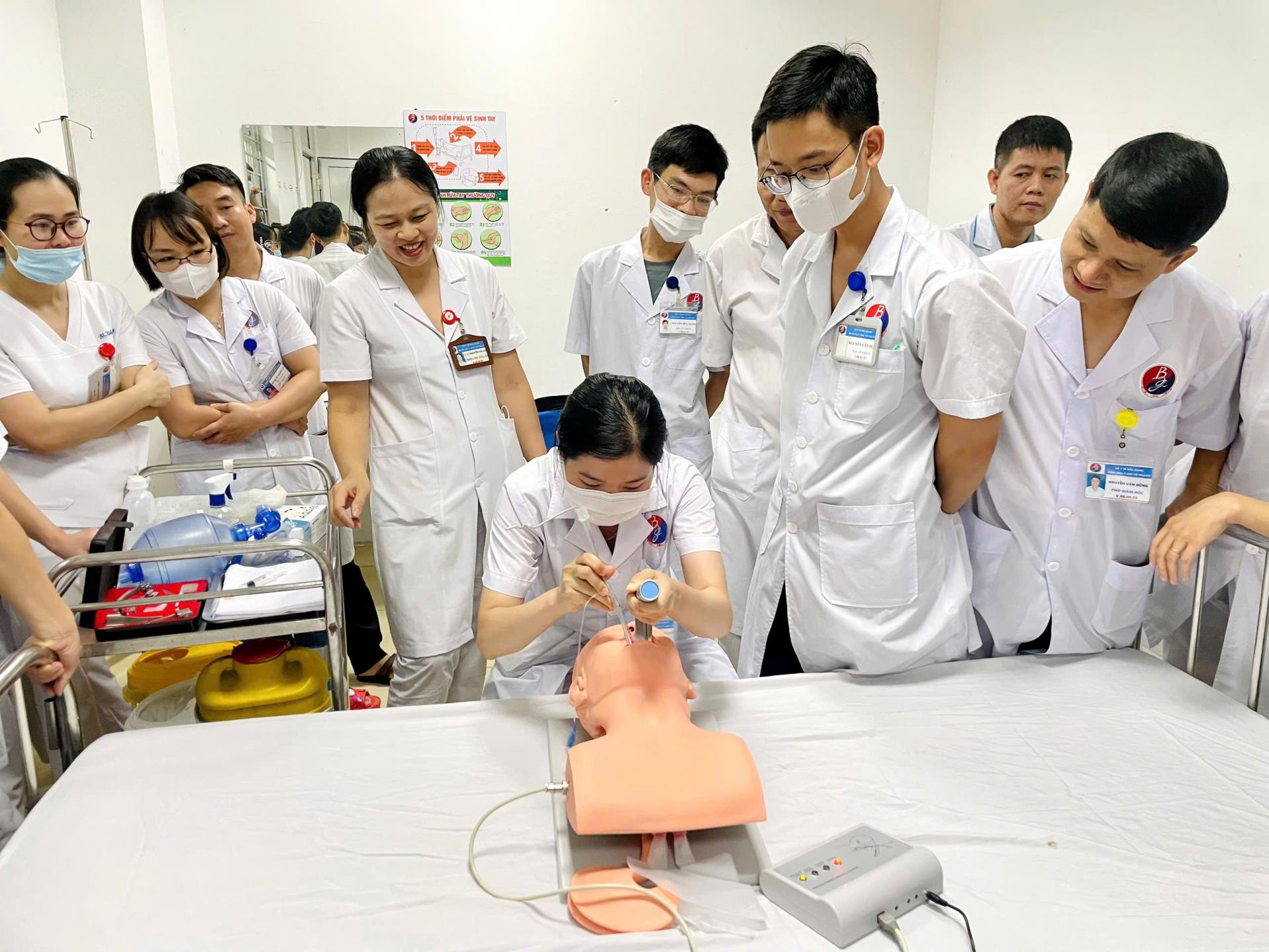Tại buổi tập huấn, các học viên đã được cập nhật kiến thức chuyên môn và thực hành các kỹ thuật quan trọng như đặt nội khí quản đúng quy trình, đảm bảo an toàn trong xử trí suy hô hấp cấp, cũng như kỹ thuật đặt sonde dạ dày để hỗ trợ nuôi dưỡng và xử trí cấp cứu đường tiêu hóa. Các nội dung được trình bày sinh động, kết hợp giữa lý thuyết và thực hành trực tiếp trên mô hình, dưới sự hướng dẫn của các Bác sĩ, Điều dưỡng nắm vững kiến thức và kỹ năng thực hành lâm sàng phong phú.
