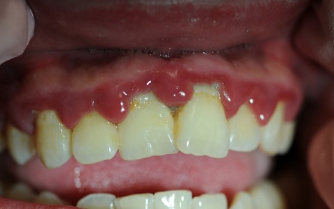 Giai đoạn đầu là viêm nướu, gây đau nhức, sưng phù nướu, sau đó bệnh âm thầm phát triển và thể hiện những dấu hiệu rõ rệt: